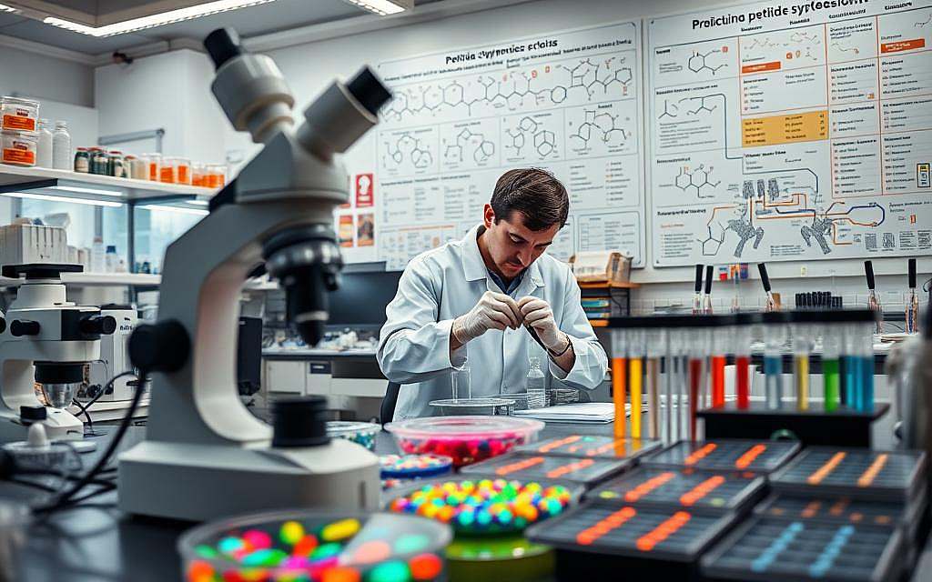 Um spezifische Polypeptide für die Forschung zu gewinnen, setzen Wissenschaftler auf effiziente Labormethoden. Die Festphasen-Synthese erlaubt den schrittweisen Aufbau von Peptidketten an einem festen Trägermaterial. Dies ermöglicht eine hohe Reinheit und Kontrolle über die Sequenz.