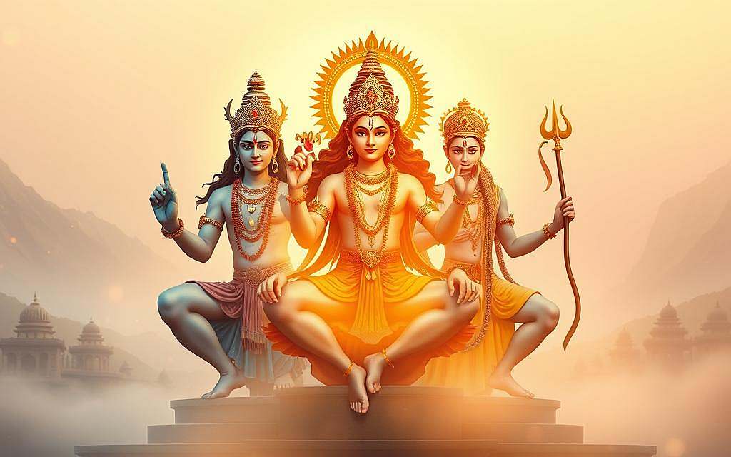 Die Trinität von Brahma, Vishnu und Shiva verkörpert die verschiedenen Aspekte des Universums. Sie zeigt die Komplexität und Tiefe der hinduistischen Kosmologie.